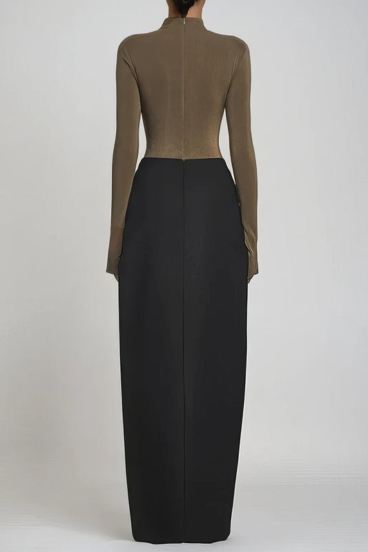 Satin Metallic Ruched Patchwork Zipper Long Sleeve Maxi Dress